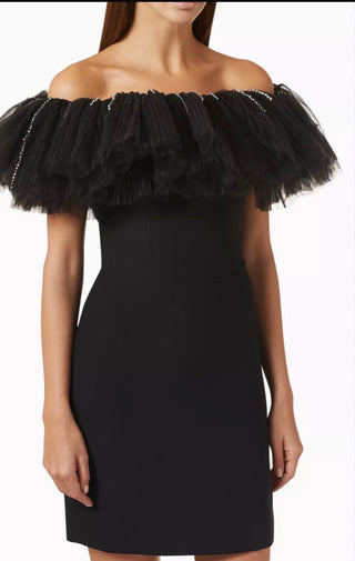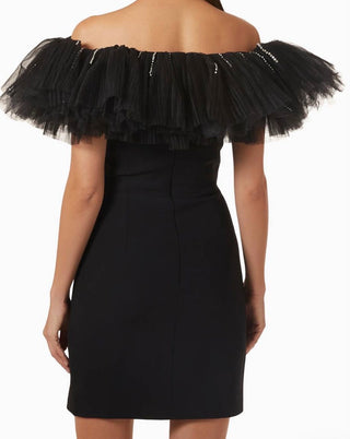 Nihan Peker Crystal Embellished Frill Tulle Mini Dress Black