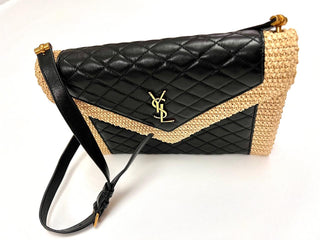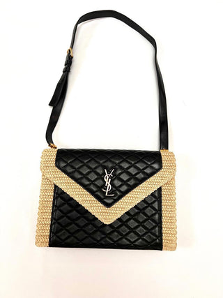 YSL Cream Raffia Black Leather Bag